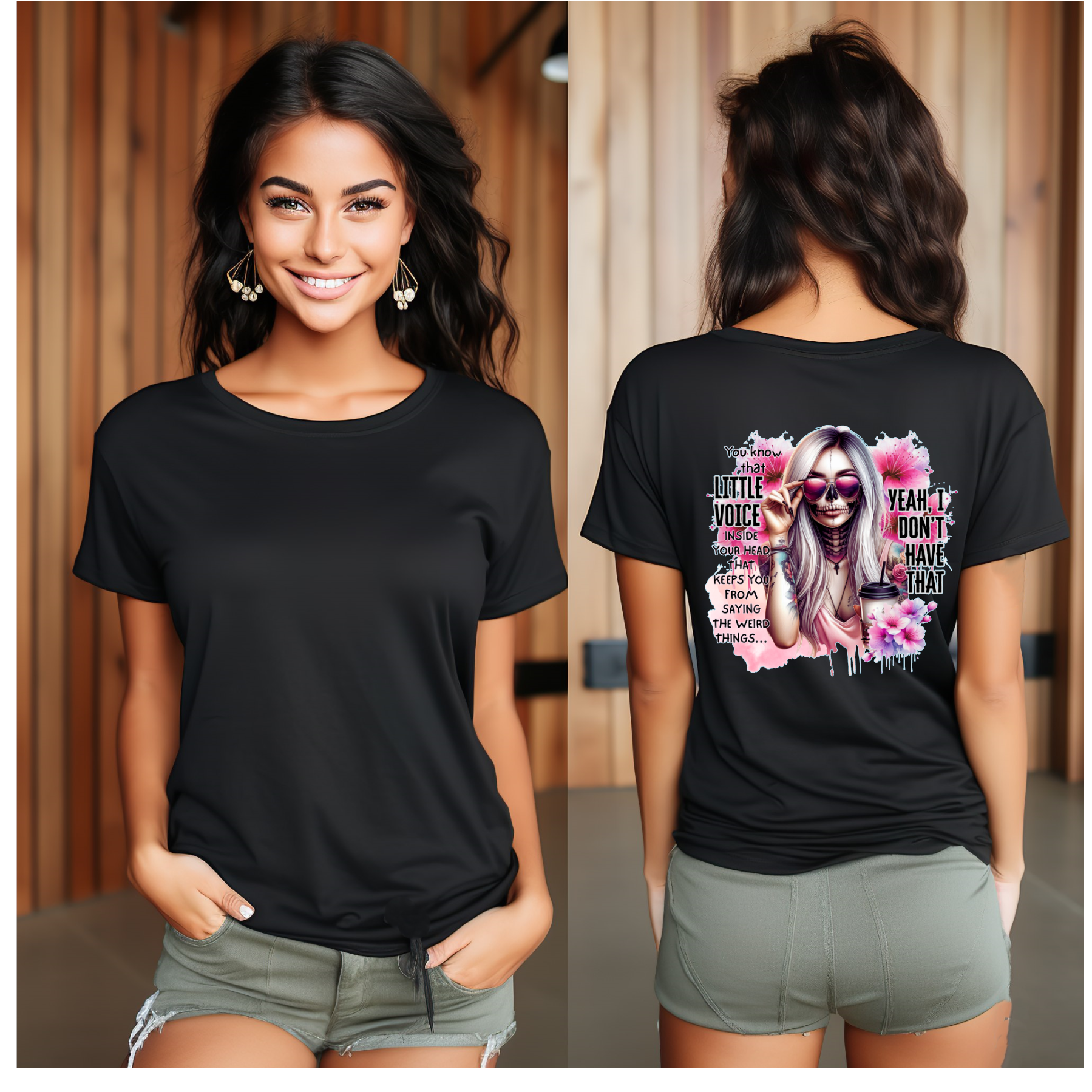 Embrace your bold side this Halloween with the Little Voice In My Head Gothic Unisex Crew Neck T-shirt. Designed for those who speak their mind without hesitation, this shirt combines edgy gothic style with comfortable fit. Perfect for standing out at any spooky gathering, it lets you showcase a fearless, unique attitude effortlessly. Comfortable and versatile, it’s an essential addition to your Halloween wardrobe that celebrates your unapologetic spirit.