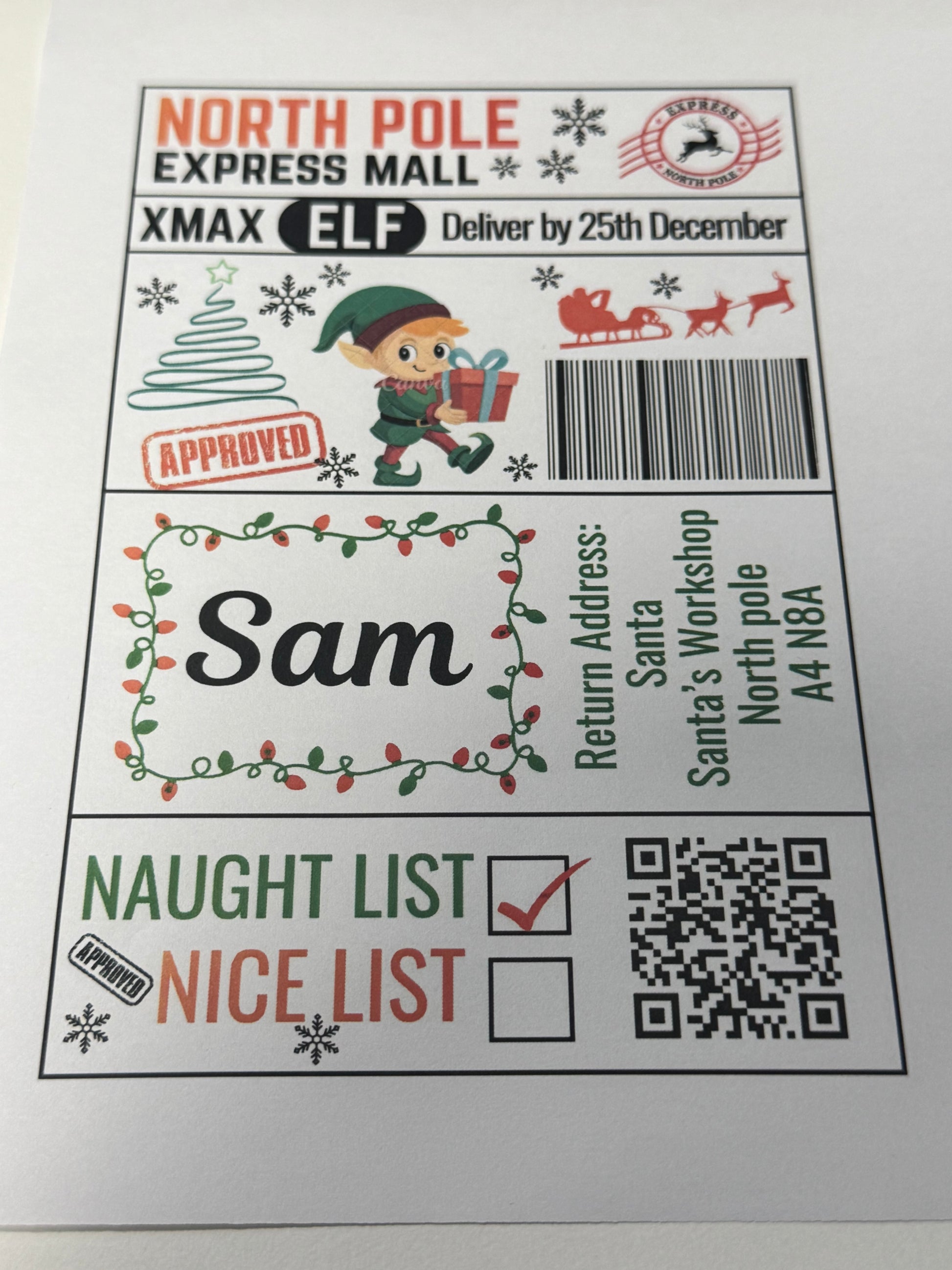 Transform your Christmas gifts with our colour North Pole Postage Labels, personalised with your child’s name for an extra touch of festive magic. Designed to look like an official postage label from Santa’s North Pole Mailroom, these stickers instantly elevate any present, box, or bag into a magical Christmas delivery.