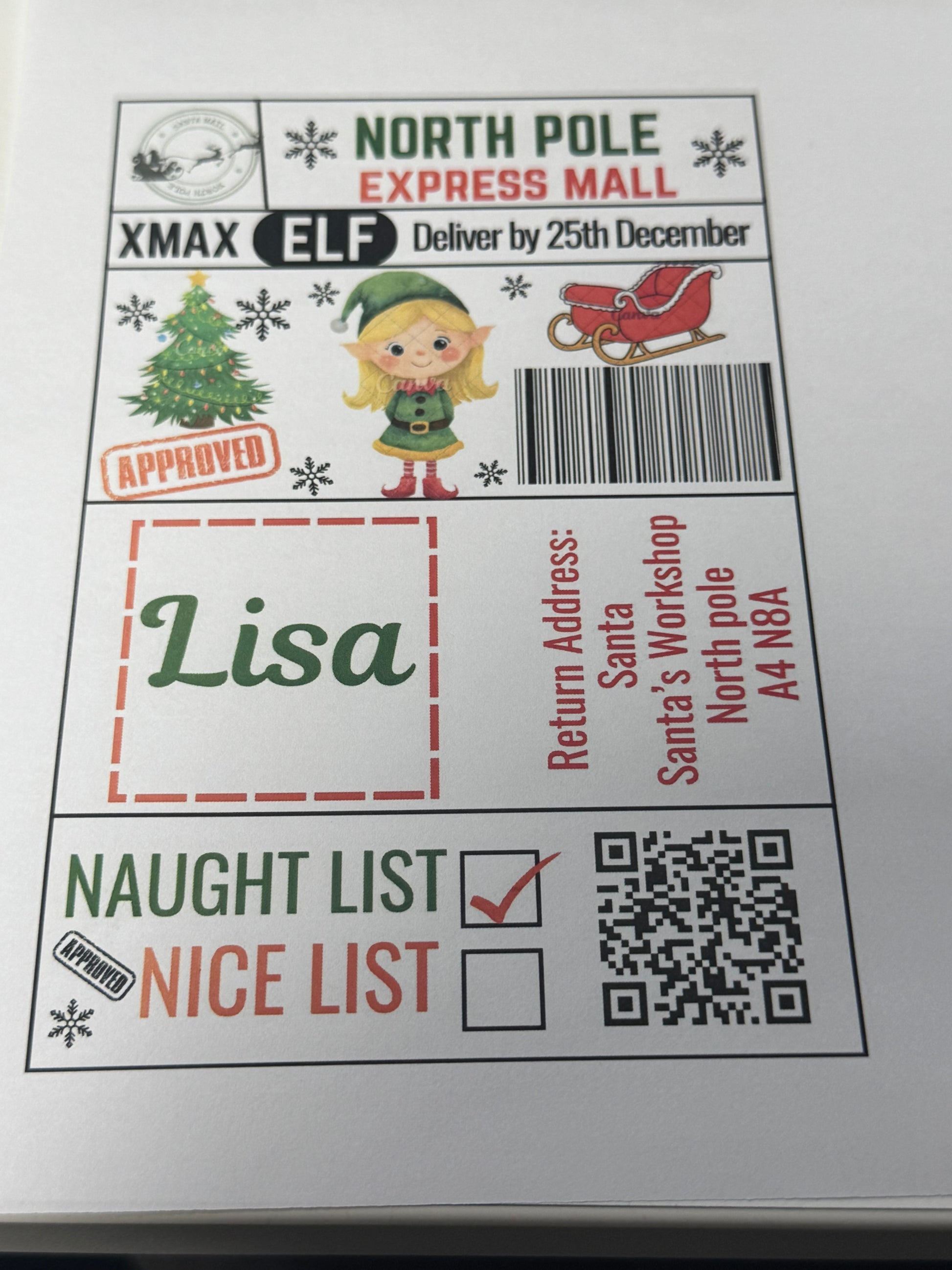 North Pole Express Mall Santa Girl Elf Naughty/Nice Gift Postage Label 4x6 inches pack 10
